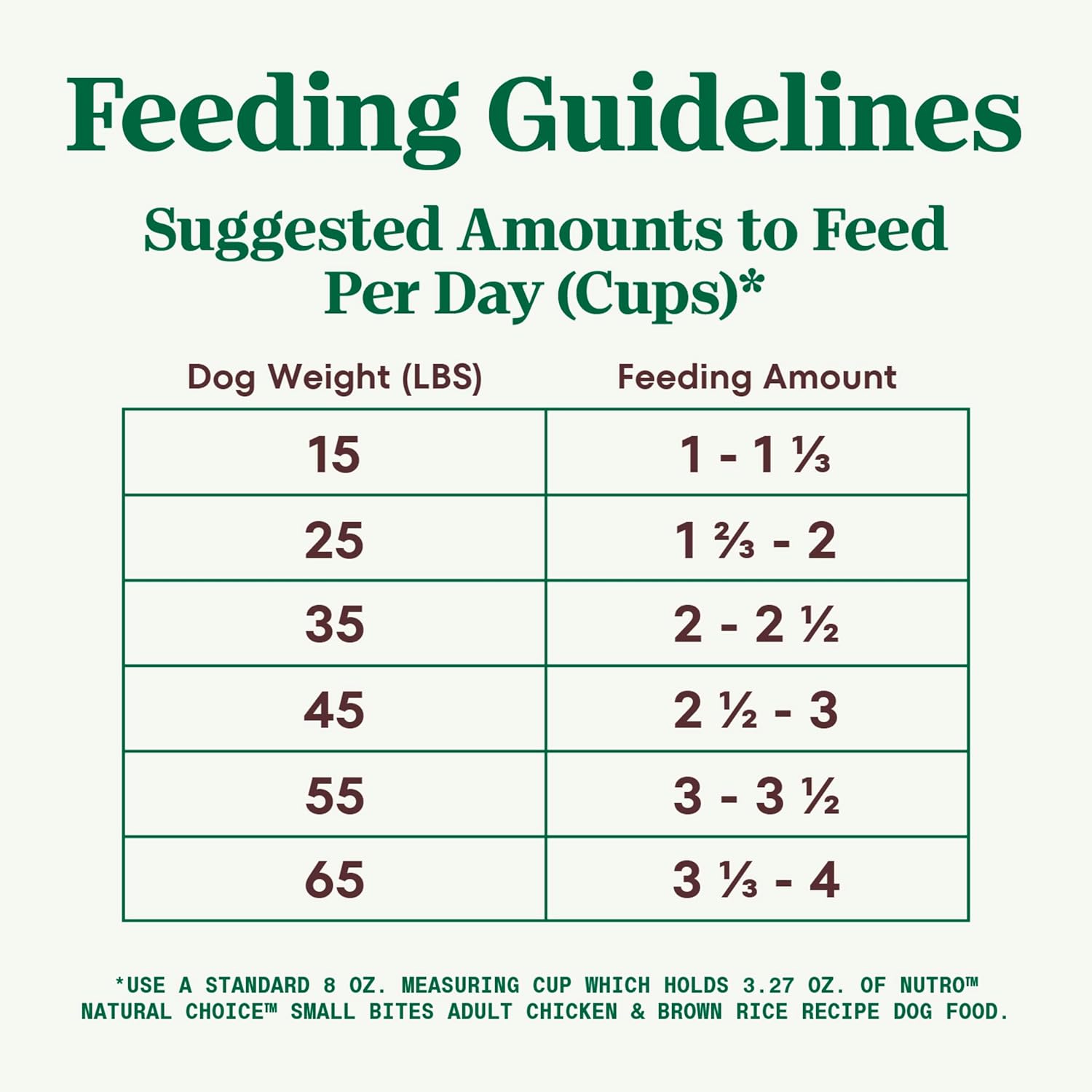 FEEDING GUIDELINES: • These are the recommended feeding amounts based on the ideal body condition for adult dogs of various weights. Individual dogs’ energy requirements may differ. Adjust the amount fed to obtain or maintain your dog’s optimum weight. Keep fresh drinking water available at all times, provide plenty of exercise and see your veterinarian regularly. Serve dry or lightly moistened. • Every cup of our food is nutrient dense so your dog gets the right amount of calories in a complete and nutritious meal. • To help maintain freshness, seal bag tightly and store in a cool, dry location. Suggested Amounts to Feed Per Day (Cups)‡ Dog Weight Feeding Amount 15 LB 1 – 1 1/4 25 LB 1 2/3 – 2 35 LB 2 – 2 1/2 45 LB 2 1/2 – 3 55 LB 3 – 3 1/3 65 LB 3 1/3 – 3 3/4 ‡Use a standard 8 oz. measuring cup which holds 3.31 oz. of NUTROâ„¢ NATURAL CHOICEâ„¢ Small Bites Adult Chicken & Brown Rice Recipe Dog Food.