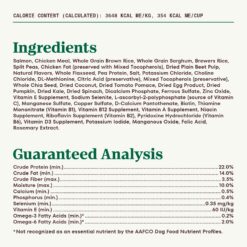 Salmon, Chicken Meal, Whole Grain Brown Rice, Whole Grain Sorghum, Brewers Rice, Split Peas, Chicken Fat (preserved with Mixed Tocopherols), Dried Plain Beet Pulp, Natural Flavors, Whole Flaxseed, Pea Protein, Salt, Potassium Chloride, Choline Chloride, DL-Methionine, Citric Acid (preservative), Mixed Tocopherols (preservative), Whole Chia Seed, Dried Coconut, Dried Tomato Pomace, Dried Egg Product, Dried Pumpkin, Dried Kale, Dried Spinach, Dicalcium Phosphate, Ferrous Sulfate, Zinc Oxide, Vitamin E Supplement, Sodium Selenite, L-ascorbyl-2-polyphosphate (source of Vitamin C), Manganese Sulfate, Copper Sulfate, D-Calcium Pantothenate, Biotin, Thiamine Mononitrate (Vitamin B1), Vitamin B12 Supplement, Vitamin A Supplement, Niacin Supplement, Riboflavin Supplement (Vitamin B2), Pyridoxine Hydrochloride (Vitamin B6), Vitamin D3 Supplement, Potassium Iodide, Manganous Oxide, Folic Acid, Rosemary Extract.