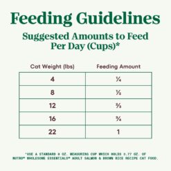 “These are the recommended feeding amounts based on the ideal body condition for adult cats of various weights. Individual cats’ energy requirements may differ. Adjust the amount fed to obtain or maintain your cat’s optimum weight. Keep fresh drinking water available at all times, provide plenty of exercise and see your veterinarian regularly. Serve dry or lightly moistened. Every cup of our food is nutrient dense so your cat gets the right amount of calories in a complete and nutritious meal To help maintain freshness, seal bag tightly and store in a cool, dry location. Suggested Amounts to Feed Per Day (Cups)‡ Cat Weight Feeding Amount 4 lbs. 1/4 8 lbs. 1/2 12 lbs. 2/3 16 lbs. 3/4 22 lbs. 1 ‡Use a standard 8 oz. measuring cup which holds 3.85 oz. of NUTROâ„¢ WHOLESOME ESSENTIALSâ„¢ Adult Cat Salmon & Brown Rice Recipe Cat Food. Transitioning To Our Food: If feeding NUTROâ„¢ Cat Food for the first time or changing recipes, we suggest you blend increasing amounts of the new recipe with your old cat food for six days.”