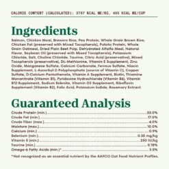 Salmon, Chicken Meal, Brewers Rice, Pea Protein, Whole Brown Rice, Chicken Fat (preserved with Mixed Tocopherols), Potato Protein, Dehydrated Alfalfa Meal, Dried Plain Beet Pulp, Whole Grain Oatmeal, Soybean Oil (preserved with Mixed Tocopherols), Natural Flavor, Potassium Chloride, Choline Chloride, DL-Methionine, Salt, Mixed Tocopherols and Citric Acid (preservatives), Taurine, Zinc Sulfate, Vitamin E Supplement, L-Ascorbyl-2-Polyphosphate (source of Vitamin C), Iron Amino Acid Chelate, Yucca Schidigera Extract, Vitamin B12 Supplement, Copper Amino Acid Chelate, Niacin Supplement, Manganese Amino Acid Chelate, Biotin, Riboflavin Supplement (Vitamin B2), D-Calcium Pantothenate, Thiamine Mononitrate (Vitamin B1), Vitamin A Supplement, Pyridoxine Hydrochloride (Vitamin B6), Sodium Selenite, Vitamin D3 Supplement, Potassium Iodide, Folic Acid, Rosemary Extract