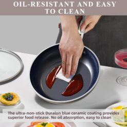- HEALTHY DURALON BLUE COATING – The eco-friendly, ultra-non-stick Gen10 Duralon Blue is all-natural ceramic coating free of harmful chemicals like PFAS*, PTFE, PFOA, lead, and cadmium. It also does not emit toxic gases at higher temperatures. *Tested by TÜV Rheinland for 106 known PFAS elements and none were detected.
