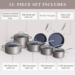 - WHAT’S INCLUDED – 1.5 qt. saucepan with lid; 2 qt. saucepan with lid; 3 qt. saucepan with lid; 5 qt. stock pot with lid; 8 qt. stock pot with lid; 8” fry pan; 9.5” fry pan. Every piece is treated with the revolutionary Duralon Blue Ceramic Coating.