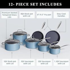 - WHAT’S INCLUDED – 1.5 qt. saucepan with lid; 2 qt. saucepan with lid; 3 qt. saucepan with lid; 5 qt. stock pot with lid; 8 qt. stock pot with lid; 8” fry pan; 9.5” fry pan. Every piece is treated with the revolutionary Duralon Blue Ceramic Coating.