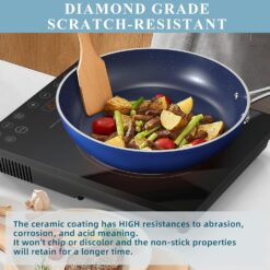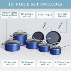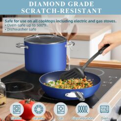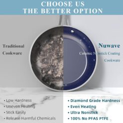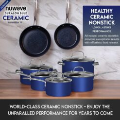 Nuwave Healthy Duralon Blue Ceramic Nonstick Cookware Set, Diamond Infused Scratch-Resistant, PFAS Free, Dishwasher & Oven Safe, Induction Ready & Evenly Heats, Tempered Glass Lids & Stay-Cool Handles, Deep Blue