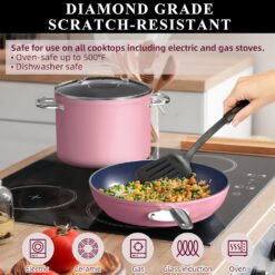 Nuwave Healthy Duralon Blue Ceramic Nonstick Cookware Set, Diamond Infused Scratch-Resistant, PFAS Free, Dishwasher & Oven Safe, Induction Ready & Evenly Heats, Tempered Glass Lids & Stay-Cool Handles, Dusty Pink