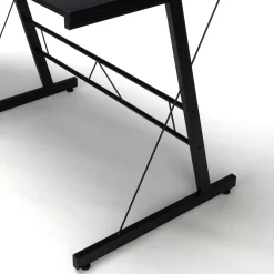 The OFM Essentials Collection is where quality meets value. This industrial modern 60″ L-Shaped Desk, Corner Computer Desk, in Black, is perfect for smaller office spaces and home offices. Featuring a particle board core surrounded by high-quality melamine laminate, the 3/4″ thick woodgrain top will wear well and complement your decor. The desk’s accent metal legs have a powder coated paint finish, in Black, for durability and adjustable glides for easy surface leveling. The desk is 60” L x 23.625” D Left – 60” L x 23.625” D Right – 29” H.