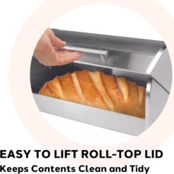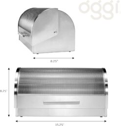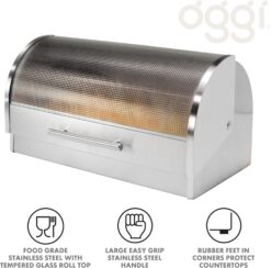 - PREMIUM QUALITY: This Oggi bread keeper is made from durable stainless steel and features a strong, tempered glass roll top lid with handle plus rubber feet to protect countertops.