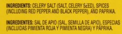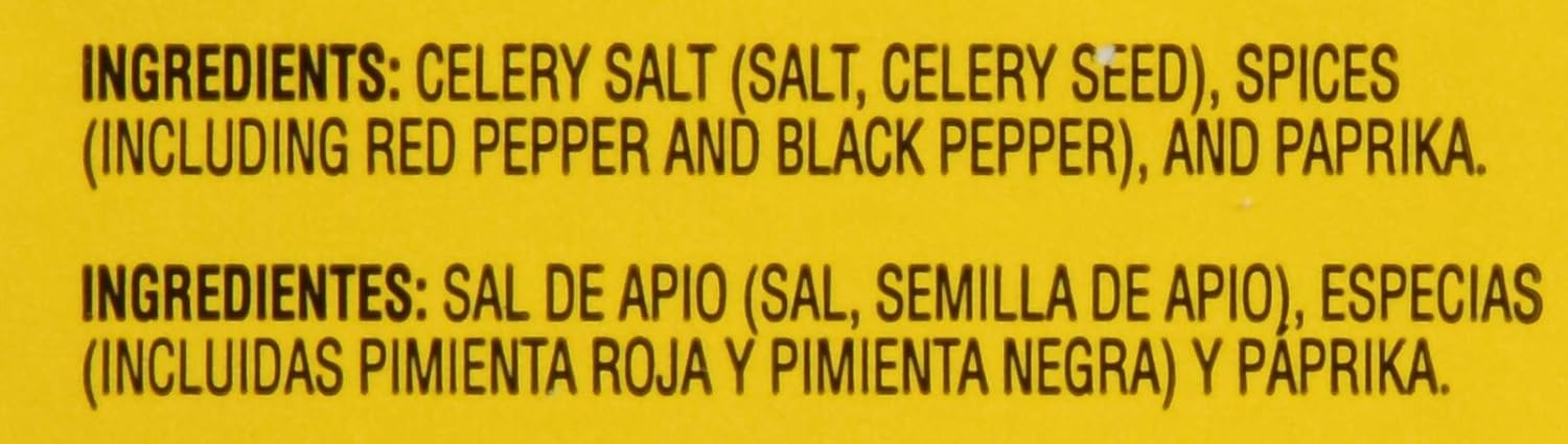 Celery Salt (Salt, Celery Seed), Spices (Including Red Pepper, and Black Pepper), and Paprika.