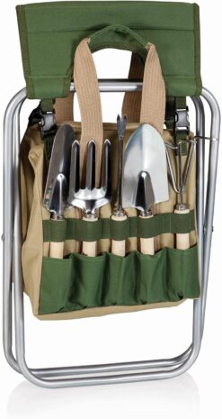 - FOLD AND GO – The Gardener Gardening Stool with Garden Tools Set by Oniva, a Picnic Time brand, is a garden tool set on a steel frame that that folds into a lightweight gardening stool with tote and garden tools