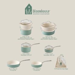 Oprah’s Favorite Things – 12 Piece Aluminum Pots and Pans Cookware Set w/Non-toxic Ceramic Non-stick, Ceramic Steamer Insert, & 12 Protective Care Bags – Sage Green