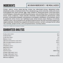 Chicken, salmon, turkey, whole herring, chicken liver, dehydrated chicken, dehydrated turkey, dehydrated sardine, dehydrated chicken liver, dehydrated egg, whole red lentils, whole pinto beans, turkey giblets (liver, heart, gizzard), eggs, rabbit, pollock oil, whole green lentils, whole navy beans, whole chickpeas, whole peas, ground miscanthus grass, natural chicken flavor, chicken fat, chicken hearts, whole cranberries, choline chloride, dried kelp, mixed tocopherols (preservative), whole pumpkin, whole butternut squash, collard greens, whole apples, whole pears, zinc proteinate, vitamin E supplement, dried chicory root, hydrolyzed yeast, dried brewers yeast, thiamine mononitrate, riboflavin, niacin, calcium pantothenate, pyridoxine hydrochloride, folic acid, vitamin B12 supplement, copper proteinate, dried Bacillus coagulans fermentation product, turmeric, sarsaparilla root, althea root, rosehips, juniper berries, citric acid (preservative), rosemary extract.