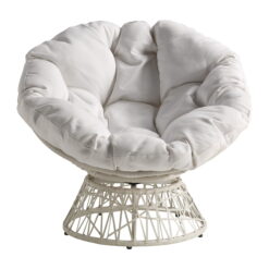 Papasan Chair with White Round Pillow Cushion and White Wicker Weave Create a laid back vibe in your home with our twist on the classic papasan chair design. Nest into the generously large Dacron-filled cushion. Enjoy the boho styling of our durable resin wicker wrapped over a metal frame. Complete with a 360° swivel to twist and turn to your heart’s content. Tune in to a time when listening to your favorite albums and sipping on a cool, refreshing drink was your only ambition for the day. Add a bit of fun to your living room, family room or dorm with our easy, casual Papasan Chair. Available in several exciting colors and finishes. Durable, well built and just plain fun!