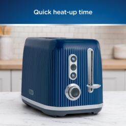 The Oster® 2-Slice Toaster features a quick-check lever to check your toast mid-cycle without interrupting toasting. The 2-slice toaster is equipped with extra-wide slots to fit a wide variety of breads, bagels, and more. Part of the Impressions Collection, this Oster toaster features a stylish, textured blue design with chrome accents that looks great on any countertop. With a quick heating time and 7 toast shade settings, the toaster quickly toasts bread, with a toasting shade for every taste. This bread toaster features custom Bagel and Frozen settings that automatically adjust toasting time for perfect results with whatever you’re making. It also includes a Cancel option which quickly stops toasting at the press of a button. This Oster toaster also features a lift lever makes it easier than ever to remove your toast once it is finished toasting, and comes with a removable crumb tray for easy cleaning.
