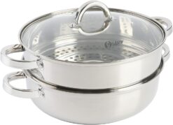 Prepare your family’s favorite meals in the Oster Sangerfield 11-inch Stainless Steel Everyday Pan with Steamer and Glass Lid. Made from durable stainless steel, it features an encapsulated base to heat and cook evenly. It is a versatile kitchen staple to perform multiple cooking styles such as sautéing, simmering, boiling, steaming, and more. The removable steamer offers a healthier style of cooking fish, vegetables, dumplings, and more, while the tempered glass lid allows easy steam release and visibility to monitor cooking progress. Lift and serve with confidence using the dual-riveted handles for a safe and comfortable grip. Dishwasher safe. Do not put in a conventional or microwave oven.