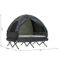 Get a comfortable night’s sleep and wake up re-energized for adventure with the all-in-one camping tent and cot combo from Outsunny. Everything you need for camping is right here with a zippered tent, elevated cot, air mattress and bedspread all together in one convenient package. Stay warm and cozy by sleeping on an elevated platform that keeps you off the cold, hard ground. Set up is simple, so you spend more time having fun and less time getting ready. When you’re finished with your trip, the included travel bag lets you store everything away until your next adventure. NOTE: This tent is meant for use in sunny, fair weather. For use in rain, use a ground cover and rainfly as this tent is not fully waterproof and cannot repel heavy rain. Do not use this tent in strong wind, hail or snow.