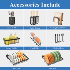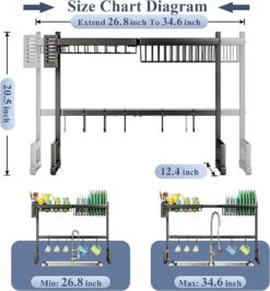 Over The Sink Dish Drying Rack, Adjustable (26.8″ to 34.6″) Large Dish Drying Rack for Kitchen Counter with Multiple Baskets Utensil Sponge Holder Sink Caddy, 2 Tier Black