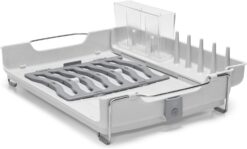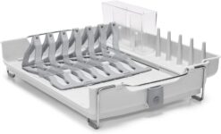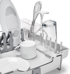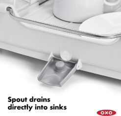 - Fold-out legs elevate Dish Rack, water drains directly into the sink through spout.Side walls, legs and spout fold in for compact storage.Dimensions open: 48.3 cm x 39.4 cm x 16.5 cm.Dimensions closed: 48.3 cm x 31.75 cm x 9.5 cm.The OXO Better Guarantee: If you experience an issue with your OXO product, get in touch with us for a repair or replacement. We’re grateful for the opportunity to learn from your experience, and we’ll make it better.
