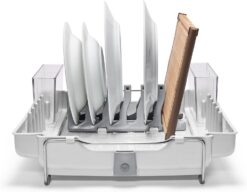 - Pop-up plate rack safely holds bowls, plates, fine china and other delicate dishware