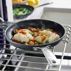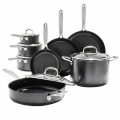 The OXO Softworks 13-Piece Non-Stick Cookware Set features a heavy-gauge aluminum body construction that delivers excellent heat conduction for quick and even cooking. With the three-layer, non-stick coating you can cook using less oil than traditional cookware. The tough stainless steel handles offer a secure grip that makes stovetop-to-oven transfers easy. A durable glass lid makes it easy to check on your progress without losing heat.