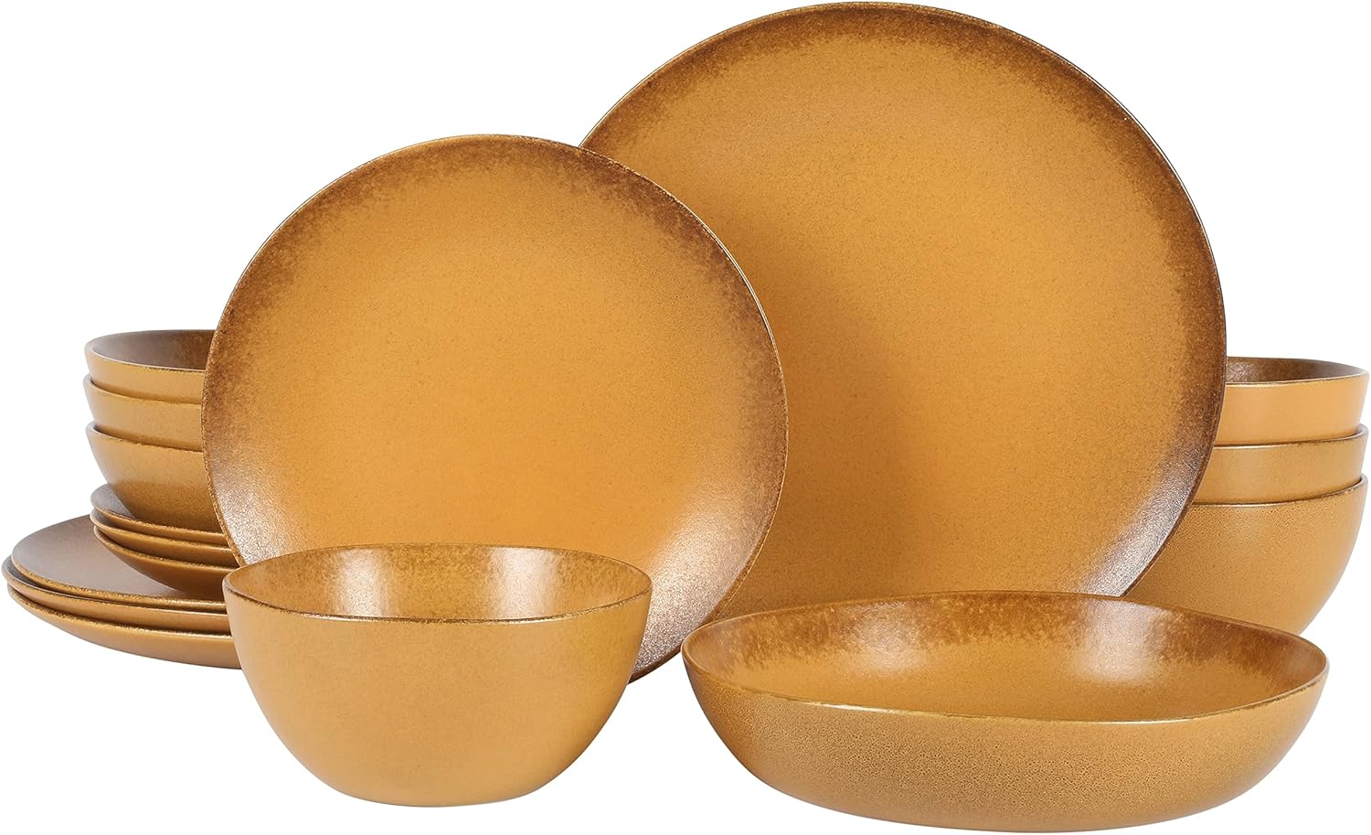 Palermo Sun Double Bowl Stoneware Reactive Glaze Plates and Bowls Dinnerware Set – Tumeric Yellow, Service for Four (16pcs)