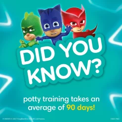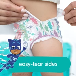 Potty-train like a hero with PJ Masks Pampers Easy Ups Training Pants. Featuring your favorite heroes Catboy, Owlette and Gekko, these super soft and comfy training pants fit just like real cotton undies with a 360 stretchy waistband that is gentle on your child’s skin and easy to pull up and down. Plus, they’re dermatologically tested, hypoallergenic, and free of parabens and latex.* That’s just one of the many reasons Pampers is the #1 pediatrician recommended brand. When it comes to potty accidents, your toddler will be covered with up to 100% leakproof protection. To protect where leaks happen most, Easy Ups are made with Dual Leak-Guard Barriers around the leg cuffs while Extra Absorb Channels quickly absorb accidents and lock them away from your toddler’s skin. And when it’s time to take them off, Easy-Tear Sides make removal and disposal a cinch. Potty-training is a journey and can take your toddler 90 days on average to catch on. So, Pampers Easy Ups makes it easy with each box containing a one-month supply of training pants. Available in sizes 2T–3T (16–34 lb), 3T–4T (30–40 lb), 4T–5T (37+ lb) and 5T– 6T (41+ lb). *Natural Rubber