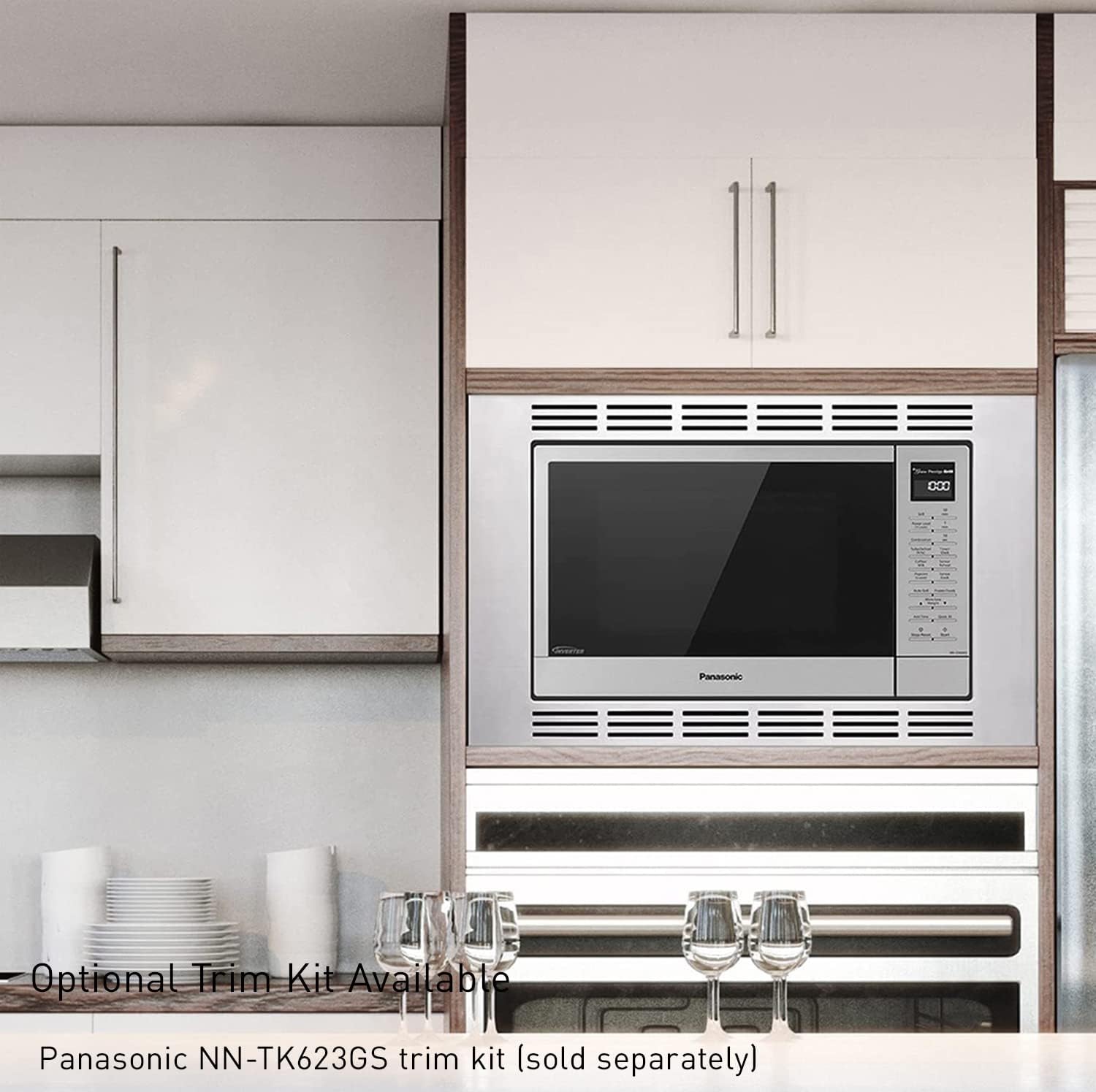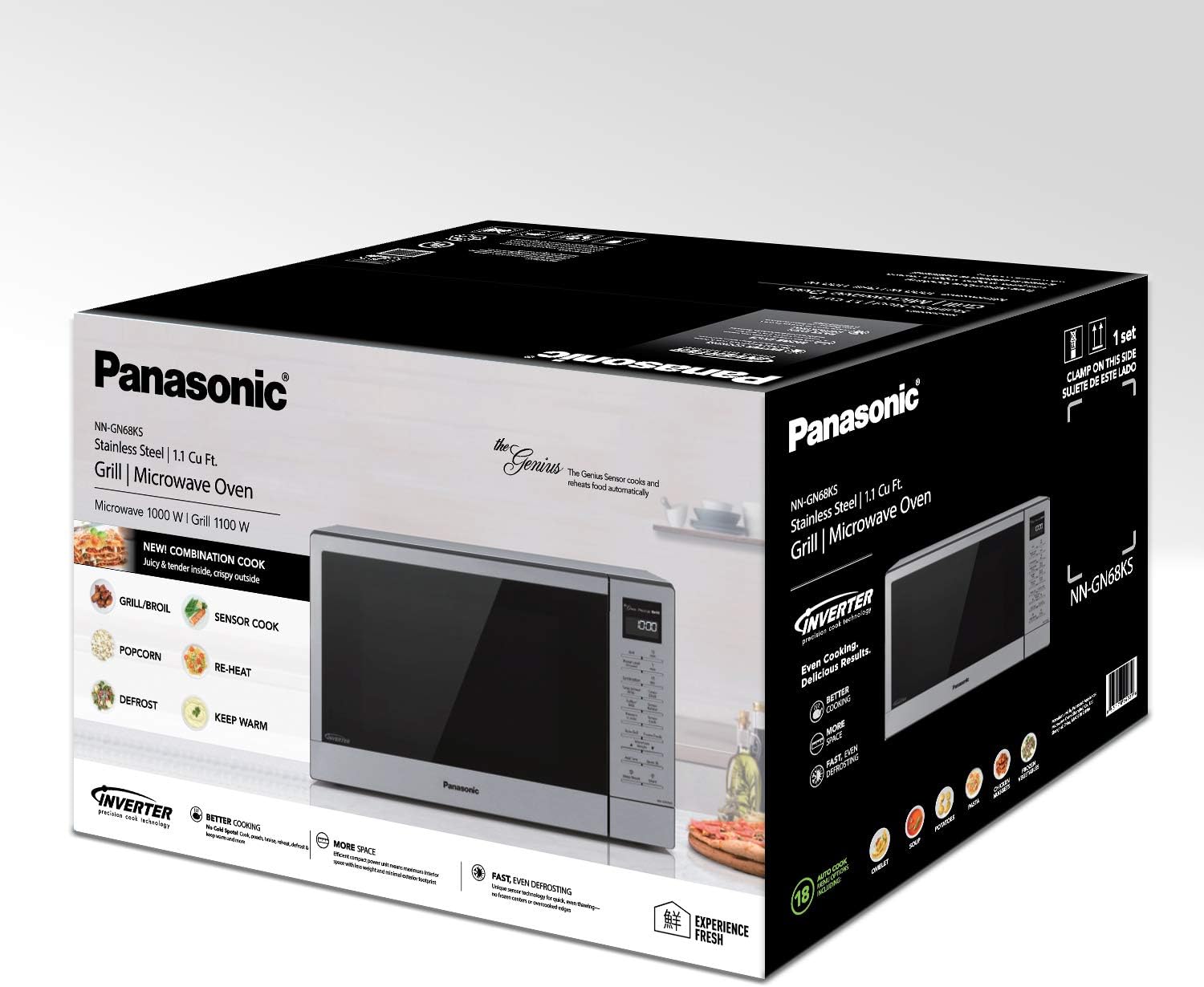 A powerful, yet small microwave oven and broiler in one! The Panasonic 2-in-1 Microwave Oven with FlashXpress Broiler (NN-GN68KS) is a multi-use kitchen appliance that makes cooking delicious family meals and snacks a breeze. Now you can broil with grill-like results using the FlashXpress Broiler, or use as a microwave to cook, defrost, and reheat food quickly and easily using smart cooking technology like Inverter, which cooks food evenly, and Genius Sensor which automatically calculates cooking and reheating times. Seven pre-set auto-cook menu options, a quick 30-second button and dedicated popcorn button are simple conveniences that make cooking easier. The 1.1 cu ft capacity first a 13.4-inch turntable and has an easy-clean interior so you can easily wipe clean splatter and spills. The sleek, modern design matches has a stainless-steel front panel to match almost any kitchen décor. The compact footprint (12.2-inch x 20.7-inch x 15.8-inch- h x w x d) fits easily even in small kitchens, or you can build the NN-GN68KS into your kitchen cabinets using an optional trim kit (NN-TK6236, sold separately). Rated output power (microwave): 1000W, rated output power (broiler): 1100W Download the DROP app to get delicious new recipes, designed just for your Panasonic GN68KS!