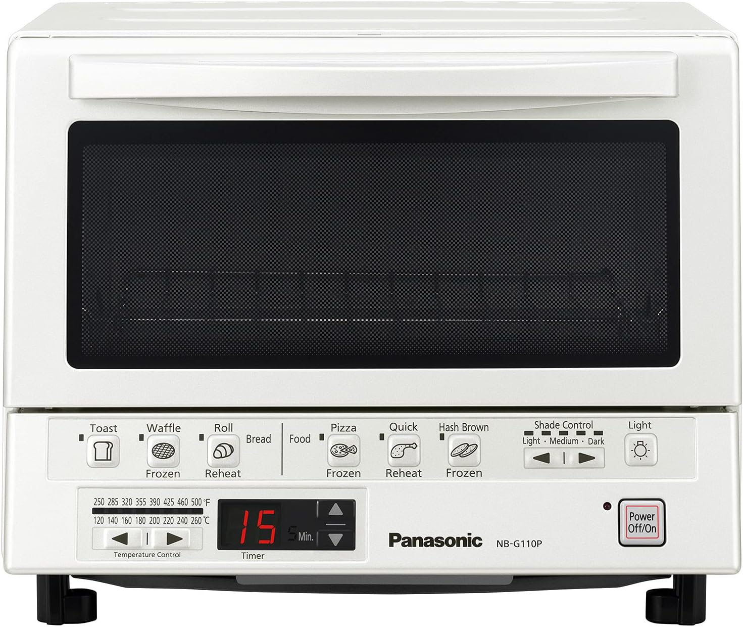 Panasonic FlashXpress compact toaster oven technology featuring double infrared ray heater for cooking up to 40% faster than conventional toaster ovens, instant heat eliminates preheating, 6 cooking menus with illustrated preset buttons, automatically calculates the cooking time for a variety of foods: bread (toast, waffles, bagels), frozen food (pizza, hash browns) and reheat (rolls, breads, leftovers), digital Timer (up to 25 minutes and temperature settings (250 Degree F to 500 Degree F), square shaped inner tray which is perfect for pizza up to 9-Inch in diameter of 4 slices of bread, removable crumb tray for easy cleaning, reminder beep lets you know when food is done, interior light allows you to view your food while cooking, internally measures 4. 1-inch (H) by 10. 2-inch (W) by 9. 8-Inch (D), 7. 5-Pound, white fire hazard safety warnings do not place any of these materials or foods in this toaster oven, as they can ignite and cause a fire: paper, plastic, cardboard, taco shells, tostada shells, tortilla chips, buttered bread or bread with jam. Raw fish or meat should always be wrapped in foil. Do not put oil in the crumb tray, cook with a dirty crumb tray or cook without the crumb tray in place. Never leave the toaster oven unattended when in use. If food begins to smoke or catch fire, first turn off the oven’s power button then disconnect the power Plug. Do not open the oven door until the flame recedes. Always read and follow cooking instructions on all food packaging. The FlashXpress G110P compact toaster oven externally measures 10. 2-inch (H) x 13-inch (W) x 12-inch (D). DISCLAIMER: Before using this toaster oven appliance, move it 10 to 15cm (4 to 6 inches) away from wall or any object on the countertop. Remove any object that may have been placed on top of the toaster oven appliance. Do not use on surfaces where heat may cause a problem.