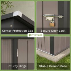 - Sloping roof and lockable door: the outdoor storage shed has a sloping roof, which adds additional storage space and prevents rust caused by rainwater accumulation, the lockable door improves security, prevents your tools from being stolen, and also prevents small animals from accidentally entering