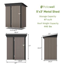 The 67 cu. ft. storage capacity of the Patiowell 5 ft. x 3 ft. Metal Shed can be more flexibly for your backyard, patio, and garden areas. Compared with the wood shed, our metal shed is more durable in any weather condition. The lockable door can help keep your stored items safe. No worry about the sharp corners which are provided by plastic protective caps. Assembly out of the box, it is recommended that more than 2-people assemble. Use it to create a great backyard shed to store your tools and equipment.