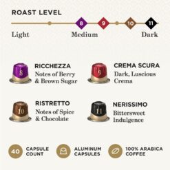 - Flavor and Roast: Ricchezza (Berry and Brown Sugar. Medium Roast) Crema Scura (Dark Luscious Crema.Medium Roast), Ristretto (Spice and Chocolate.Dark Roast), Nerissimo (Bittersweet Indulgence. Dark Roast)