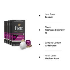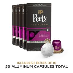 - Contains five (5) Boxes of 10 Peet’s Ricchezza, Café inspired Espresso – Intensity 8 Medium Roast Coffee Single Cup Espresso Capsules (50 Espresso Capsules Total)