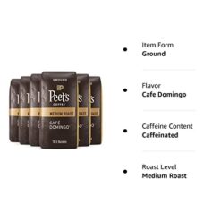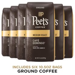- Contains six (6) 10.5 Ounce Bags of Peet’s Cafe Domingo Ground 100% Arabica Coffee