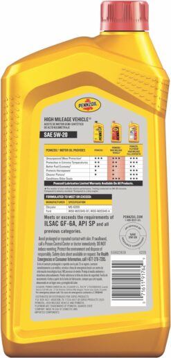 Pennzoil High Mileage SAE 5W-20 Motor Oil is a synthetic blend motor oil engineered for cars that have accumulated more than 75,000 miles and provides proven wear protection. As your car ages, leaks may develop and cause higher oil consumption and burn off which is why your engine might be needing frequent top-offs. Severe oil consumption and oil burn off may also cause other issues, leaving deposits on the internal parts of your engine. Pennzoil High Mileage motor oil is enhanced with an outstanding combination of special conditioning seal agents and additives to help stop leaks from aging seals, reduce the oil consumption that is typical of older and worn engines, and helps prevent sludge and other damaging deposits. It comes with free warranty coverage of up to 10 years or 300,000 miles* (whichever comes first). It meets or exceeds the following OEM requirements: Chrysler MS-6395; Ford WSS-M2C960-B1 and WSS-M2C960-A. Meets or exceeds the requirements of the following industry specifications: API SP-RC and all previous categories; ILSAC GF-6A. For a full list of equipment approvals and recommendations, please consult your local Shell Technical Help Desk and always consult your owner’s manual. (*Pennzoil Lubrication Limited Warranty: Up to 10 years or 300,000 miles, whichever comes first, if you exclusively use Pennzoil motor oil, Pennzoil Professional motor oil, Pennzoil Gold Synthetic Blend motor oil, Pennzoil High Mileage motor oil, or Pennzoil Full Synthetic motor oil. Your engine must have less than 125,000 miles and have been manufactured in the past 72 months. To maintain your warranty, change your vehicle’s oil and oil filter at least as often as recommended by the vehicle manufacturer. Enrollment required. Keep your receipts. Other conditions apply. See Pennzoil.com/warranty for full details and terms.)