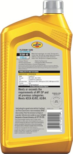 Pennzoil Platinum Euro 5W-40 Full Synthetic motor oil is made with natural gas and designed for complete protection for modern light-duty diesel and high-performance engines in European vehicles. Pennzoil Platinum Euro 5W-40 Full Synthetic motor oil helps extend engine life and protects for up to 15 years or 500,000 miles, whichever comes first, guaranteed*. Pennzoil Platinum Euro far exceeds the most stringent car manufacturer requirements for cleanliness and protection based on Mercedes-Benz, VW, and Porsche specifications. It provides superior wear protection (based on Sequence IVA and Sequence VIII engine tests carried out in an independent laboratory), superior piston cleanliness up to 45% cleaner (based on DV4TD vs. ACEA C2/C3 using SAE 0W-30), and better fuel economy for up to 2.6% (based on ACEA M111 fuel economy results vs. the industry reference oil). Exceeds the following industry requirements: API SN and all previous categories; ACEA C2, C3. Meets or exceeds the requirements of the following OEM specifications: Mercedes-Benz MB-Approval 229.31, MB-Approval 229.51, MB-Approval 229.52; Porsche C30; Volkswagen 504 00/507 00. For a full listing of equipment approvals and recommendations, please consult your local Shell Technical Helpdesk. (*Pennzoil Platinum Lubrication Limited Warranty: Up to 15 years or 500,000 miles, whichever comes first, guaranteed, if you exclusively use Pennzoil Ultra Platinum Full Synthetic motor oil, Pennzoil Platinum Full Synthetic motor oil, Pennzoil Platinum Euro Full Synthetic motor oil, and Pennzoil Platinum High Mileage Full Synthetic motor oil. Your engine must have less than 125,000 miles and been manufactured in the past 72 months. To maintain your warranty, change your vehicle’s oil and oil filter at least as often as recommended by the vehicle manufacturer. Enrollment required. Keep your receipts. Other conditions apply. See Pennzoil.com/warranty to enroll and for full details and terms.)