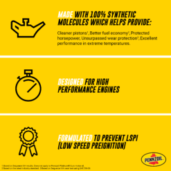 - Full synthetic engine oil made with natural gas, not crude, using Pennzoil’s patented gas-to-liquid PurePlus Technology