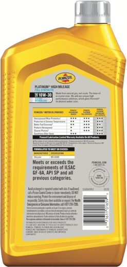Pennzoil Platinum High Mileage SAE 10W-30 is a full synthetic motor oil made with natural gas formulated to reduce oil burn off and stop leaks in engines with more than 75,000 miles. No other leading high mileage motor oil provides better protection from friction (based on Sequence IVA wear test using SAE 5W-30), protects engines from loss of horsepower, offers excellent performance in extreme temperatures, and helps extend engine life and protects for up to 15 years or 500,000 miles, whichever comes first, guaranteed*. Pennzoil Platinum High Mileage SAE 10W-30 is engineered to help keep engines clean by gently lifting deposits and keeping them away from critical moving engine parts. In fact, it keeps pistons up to 45% cleaner than the toughest industry standards (based on Sequence IIIH results). It meets or exceeds the following OEM requirements: Chrysler MS-6395. It also exceeds the requirements of the following industry specifications: API SP-RC and all previous categories; ILSAC GF-6A. For a full list of equipment approvals and recommendations, please consult your local Shell Technical Help Desk and always consult your owner’s manual. (*Pennzoil Platinum Lubrication Limited Warranty: Up to 15 years or 500,000 miles, whichever comes first, guaranteed, if you exclusively use Pennzoil Ultra Platinum Full Synthetic motor oil, Pennzoil Platinum Full Synthetic motor oil, Pennzoil Platinum Euro Full Synthetic motor oil, and Pennzoil Platinum High Mileage Full Synthetic motor oil. Your engine must have less than 125,000 miles and been manufactured in the past 72 months. To maintain your warranty, change your vehicle’s oil and oil filter at least as often as recommended by the vehicle manufacturer. Enrollment required. Keep your receipts. Other conditions apply. See Pennzoil.com/warranty to enroll and for full details and terms.)