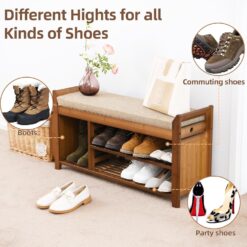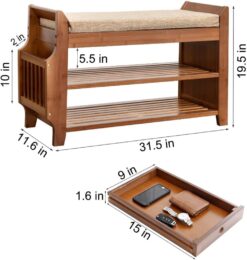 - Dimensions- The shoe rack for entryway cabinet is easy to install following the manual. Overall dimension- 31.5″(L)x11.9″(W)x19.5″(H). The shoe rack has 2-tier shelves. You could store 6-7 pairs of shoes.shoe storage bench with hidden shoe rack