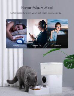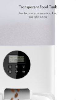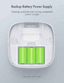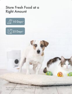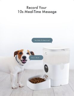 - Simply allot the time, meals, and portions on the LCD screen—and even record a personalized voice message for your furbaby!