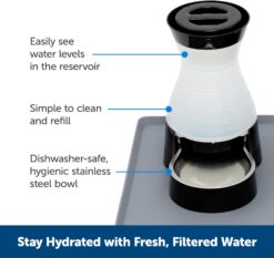 The PetSafe Healthy Pet Water Station will revolutionize your pet’s drinking water and your home environment. With this gravity water station, your pet gets fresh water, whenever he needs it, served in a stainless steel bowl. Refill the reservoir with water and watch the bowl automatically fill up with fresh, filtered water. The water station disassembles for easy cleaning and the removable, stainless steel bowl is dishwasher safe.