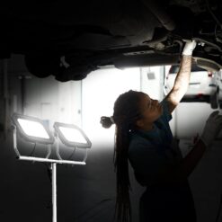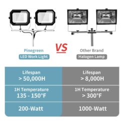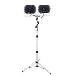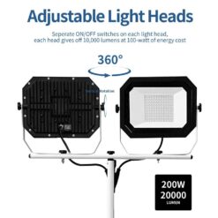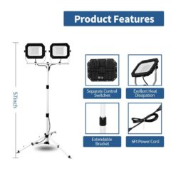 Pinegreen Lighting Twin-Head LED Work Light is a good choice for professional construction or home use. The 2 detachable light heads can generate 20,000 Lumens (10,000 Lumens each) of brightness at only 200-Watts of energy cost (2000-Watts incandescent equivalent). The tripod is adjustable from 3′ to 5′, the two lamp heads can be rotated. It allows you to modify the illumination at your will. It features a 6 ft. 18/3 SJTW power cord for convenience and 2 weatherproof power switches for safer outdoor applications. It can last up to 50,000 hours, saves you the money and labor of replacing it.