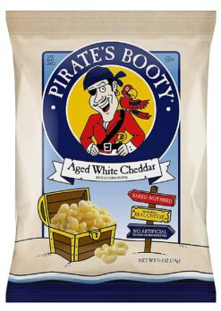 - Pirate’s Booty Aged White Cheddar Cheese Puffs contain 24 (0.5oz) snack size bags