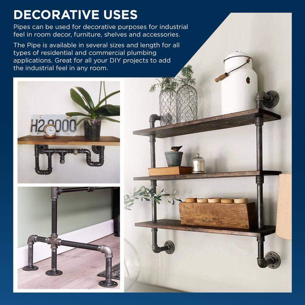 The Plumber’s Choice steel pipes are made of the best quality steel material it has a black finishing to provide greater rust resistance. Our pipes are schedule 40 and is available in various sizes to fit all your residential, commercial gas and air applications. In addition to all plumbing use these pipe nipples are also great for DIY projects to build industrial furniture shelves etc. You can use these for industrial retro wall mount iron pipe shelf. Give the rustic look for indoor and outdoor applications.