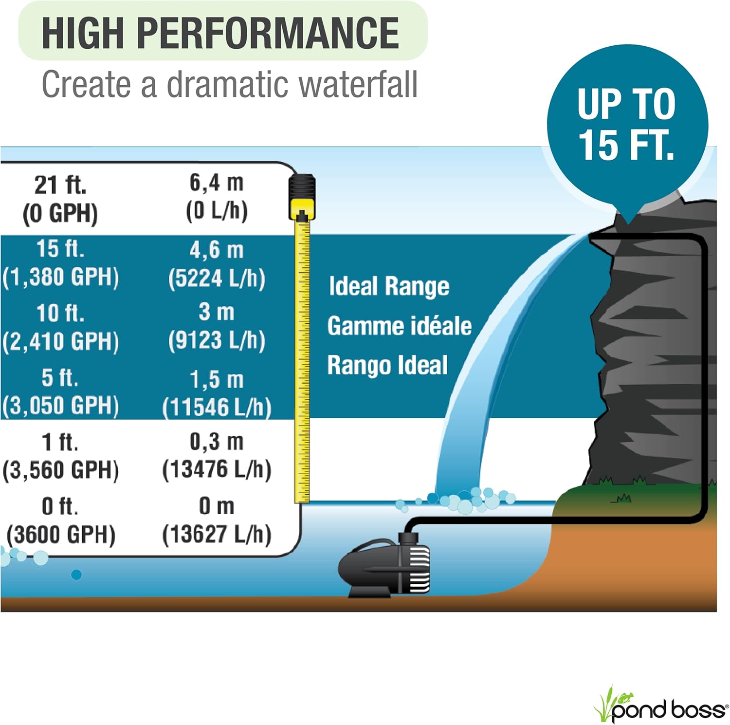 - HIGH PERFORMANCE & SUPERIOR EFFICIENCY – this ETL Listed 3,600 GPH pump is ideal for dramatic waterfalls up to 10 ft. tall, while only using 170 watts for unmatched power and low energy consumption