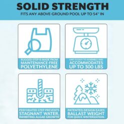 Durable maintenance-free polyethylene construction, universal fit for above-ground pools up to 54 in. Safety features such as wide slip-resistant platform, and a high weight capacity. Designed to meet or exceed all SNIP standards for safety and swimmer entrapment, this pool step ensures a secure and reliable entry and exit from your pool.