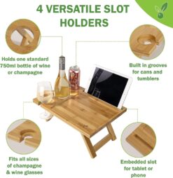 - Our sustainably made bamboo outdoor wine table has a safe slot for your tablet or phone to watch movies or listen to music. Tray holds glasses, cans, snacks.