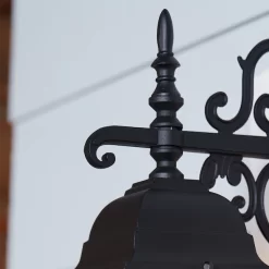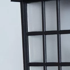 - Black die-cast aluminum fixture with frosted flat glass is weather-resistant and sturdy