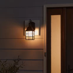 Add extra lighting wherever you need it with this Portfolio outdoor wall light. The black die-cast aluminum fixture with frosted flat glass is weather-resistant and sturdy, ensuring durability from season to season. The hardware is included, making setup a breeze. Brighten up your entranceway effortlessly with this outdoor wall light.