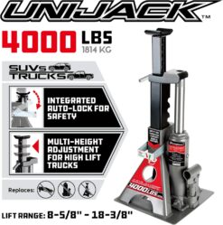 - STRONG: The Unijack lifts and supports a variety of vehicles with 4000-pound capacity and lift range of 8-5/8″ to 18-5/8″