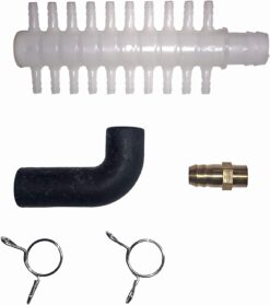 - Powerful Output with Minimal Energy Consumption- FLF pond aerator pumps have an output capacity of 7.1 CFM (200 LPM). The pump is efficient using only 180 Watts. Each pump comes with a 6′ power cord, and will easily connect to any Fawn Lake aeration manifold. Also included is a 90 degree output hose, two stainless steel hose clamps, a multi-port distribution manifold and and brass hose barb adapter.