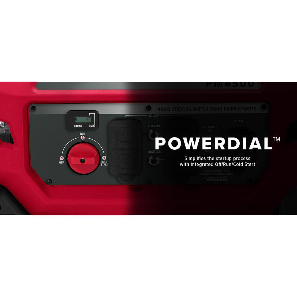 Ideal for use around the home or the next DIY project, the PM4500 is durable and compact for easy transport. The PM4500 features a steel frame and a compact design with integrated wheels and handle that makes it easy to move and put in place. With 4500 starting watts and 3600 running watts, this generator is powerful enough to run small electrical appliances at any picnic, campground or tailgate and versatile enough to power tools for your next DIY project. The PM4500 is equipped with features that make using the generator easy and approachable. The PM4500 is easy to start with POWERDIAL, which integrates the off/run/choke settings into 1 simple-to-use dial. Onboard COsense technology provides powerful protection from hazardous carbon monoxide. The 224 cc Generac OHV engine provides consistent power for multiple applications while a 5 Gal. fuel tank delivers up to a 19-hour runtime at 25% load.